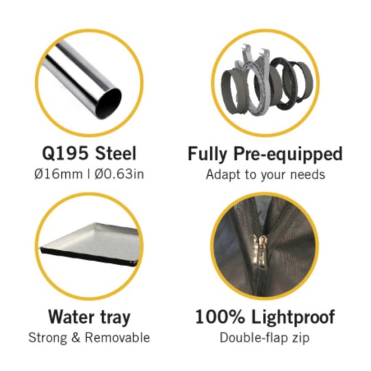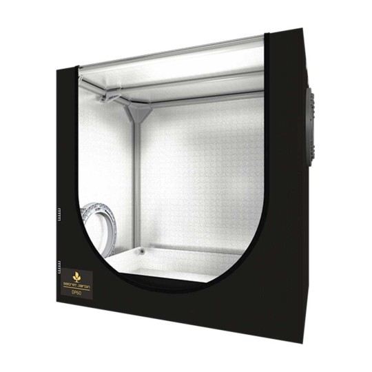 Premium quality compact growtent for cuttings, seedlings, and mother plants, pre-equipped with adjustable ducting flanges, water tray, and cable fixing clips.