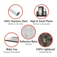 Hydro Shoot SMALL grow tents can operate in vertical (0.16m2) or horizontal (0.48m2) position. The rolling door on the front wall provides an easy access to the plants. It features 150mm sock for the air exhaust port, 75mm cable sleeve, and 20x30cm window for passive intake. Two handling poles may take 20kg in total.