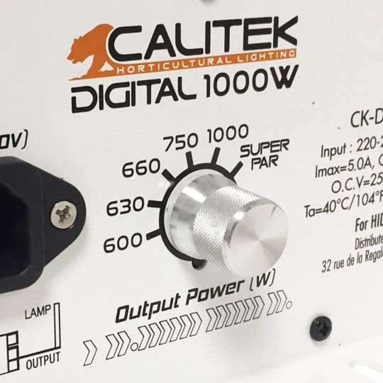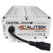 The Calitek 1000 W electronic/digital ballast is compatible with DOUBLE-ENDED (DE) CMH, MH, and HPS lamps, and its high operating frequency (100–160 kHz) allows the lamp to operate at constant power, extending its lifespan and increasing its luminous efficacy. It has a high power factor and high luminous efficiency, as well as a low total harmonic distortion (THD) coefficient.