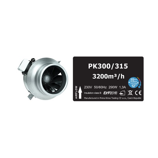 Prima Klima BLUE LINE PK300/315 är utrustad med en högeffektiv tysk ZIEHL-ABEGG-motor med ett otroligt luftflöde på 3200m³/h och en tryckuppbyggnad på upp till 650Pa med endast 280W och bara 1350 varv/min. BLUE LINE-fläkten är konstruerad för kontinuerlig non-stop-drift (över 80.000 timmar vid full hastighet). Fläkten kan arbeta med låga ljudnivåer (68 dB) och överträffar med råge ERP2015-direktivet om energieffektivitet. Ström- och styrsystemen är placerade i en högkvalitativ kopplingsdosa som är helt monterad med en Schuko-strömkabel. Förinstallerade, robusta monteringsfästen möjliggör en perfekt positionering i rummet.