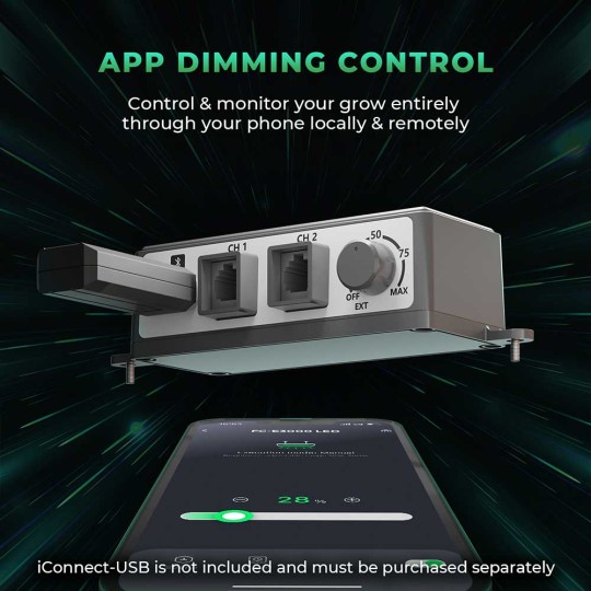 APP-dimning - styr och övervaka din odling helt via din telefon lokalt och på distans. iConnect USB ingår inte och måste köpas separat. Upp till 30 FC-6500-lampor kan anslutas i en kedjekoppling.