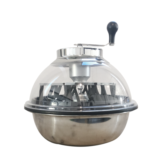 Bowl Trimmer, en praktisk handhållen biomassaklippare. Bowl Trimmer tar bort alla överflödiga löv med nästan inget ljud och viktigast av allt ingen elektricitet. Färska knoppar skärs (3 - 5 cm) och placeras på ett avtagbart rutnät. Under det finns en stålkniv med ett dubbeleggat blad (eller stålsträng), som tack vare kugghjulsvevens rotation börjar rotera snabbt och skära av bladen som sticker ut under gallret.